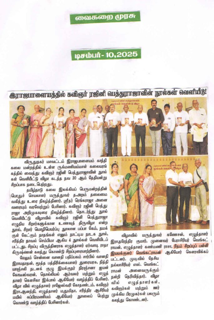 Our school Principal participated in the book release function of Rajini Pethu Raja held at Rajapalayam. The event was published in the Vaigarai Murasu daily newspaper.
