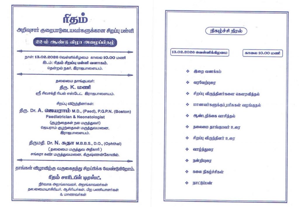 We would like to sincerely thank you for your continuous support to ‘Ritham special school’. We salute the noble work that you do spread our service to worldwide. Everyone indirectly help to our students get better service and get more donors.